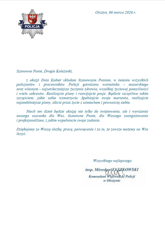 Życzenia Komendanta Wojewódzkiego Policji w Olsztynie z okazji Dnia Kobiet
