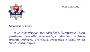 "Życzę Państwu, abyśmy wszyscy znaleźli czas na to, żeby w pełnym skupieniu docenić to, co najważniejsze, a więc tych, z którymi zasiadamy do świątecznych stołów" - wielkanocne życzenia insp. Mirosława Elszkowskiego Komendanta Wojewódzkiego Policji w Olsztynie