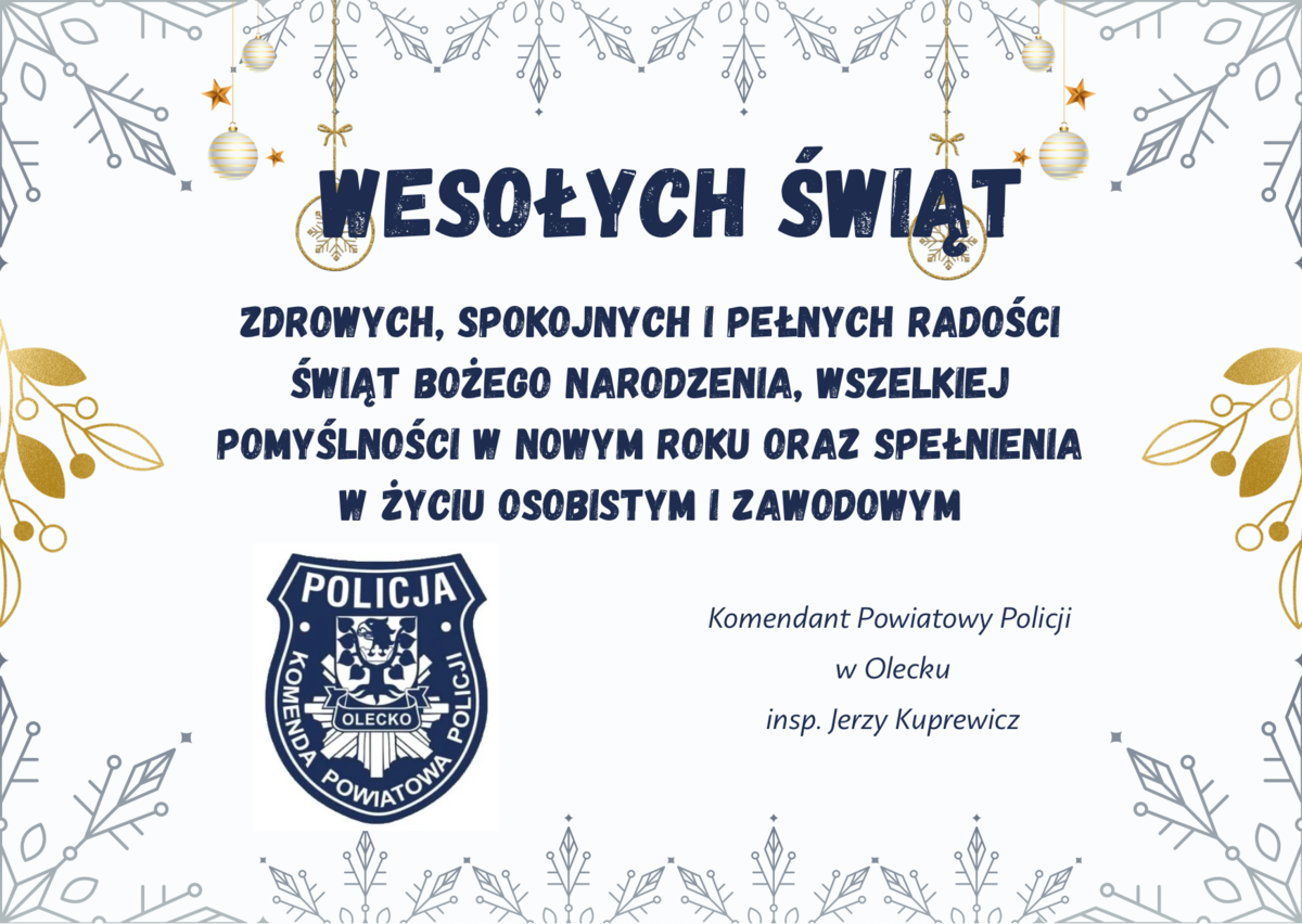 Z okazji zbliżających się Świąt Bożego Narodzenia i Nowego Roku Komendant Powiatowy Policji w Olecku insp. Jerzy Kuprewicz wraz z policjantami i pracownikami cywilnymi oleckiej komendy składa życzenia wszystkim mieszkańcom powiatu oleckiego.