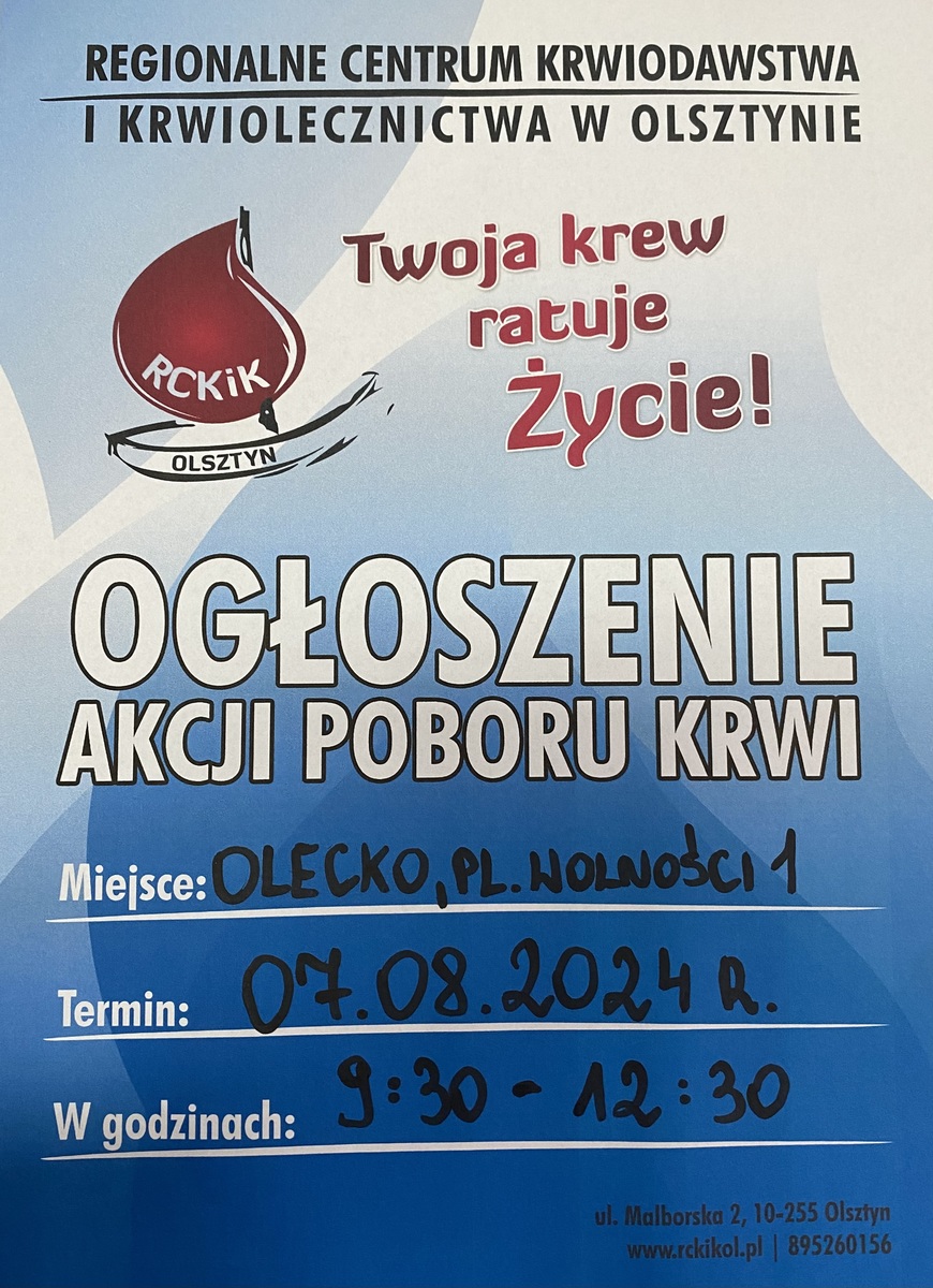 7 sierpnia 2024 roku odbędzie się akcja poboru krwi, którą organizuję Komenda Powiatowa Policji w Olecku wspólnie z Regionalnym Centrum Krwiodawstwa Krwiolecznictwa w Olsztynie. Akcja odbędzie się w Olecku przy Placu Wolności 1 .
