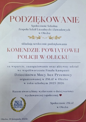 W dniu 19 listopada br. w Zespole Szkół Licealnych i Zawodowych w Olecku odbył się finał kampanii „ Dzieciństwo mocy – bez przemocy”. To bardzo ważna inicjatywa, która przypomina, że przemoc nigdy nie powinna być akceptowana. Takie działania pokazują, że jako społeczność potrafimy głośno powiedzieć STOP. Tylko razem możemy realnie wpływać na to, by osoby doznającej przemocy nie zostawały same ze swoim problemem.