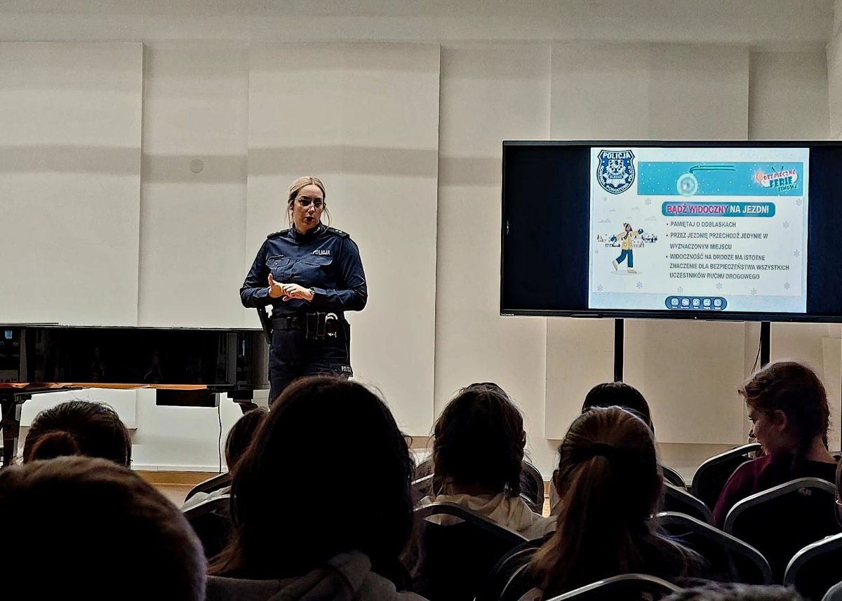W poniedziałek 12 stycznia br. policjantka na co dzień zajmująca się profilaktyką przeprowadziła spotkanie w Państwowej Szkole Muzycznej w Olecku. Podczas pogadanki omówione zostały najważniejsze zasady w czasie ferii, zarówno podczas zabaw na świeżym powietrzu, jak i w domu czy w trakcie wyjazdów. Funkcjonariuszka zwróciła szczególną uwagę na zagrożenia związane z zabawami na zamarzniętych zbiornikach wodnych, ryzyko wychłodzenia organizmu oraz unikania miejsc i sytuacji mogących stanowić zagrożenie dla zdrowia i życia.