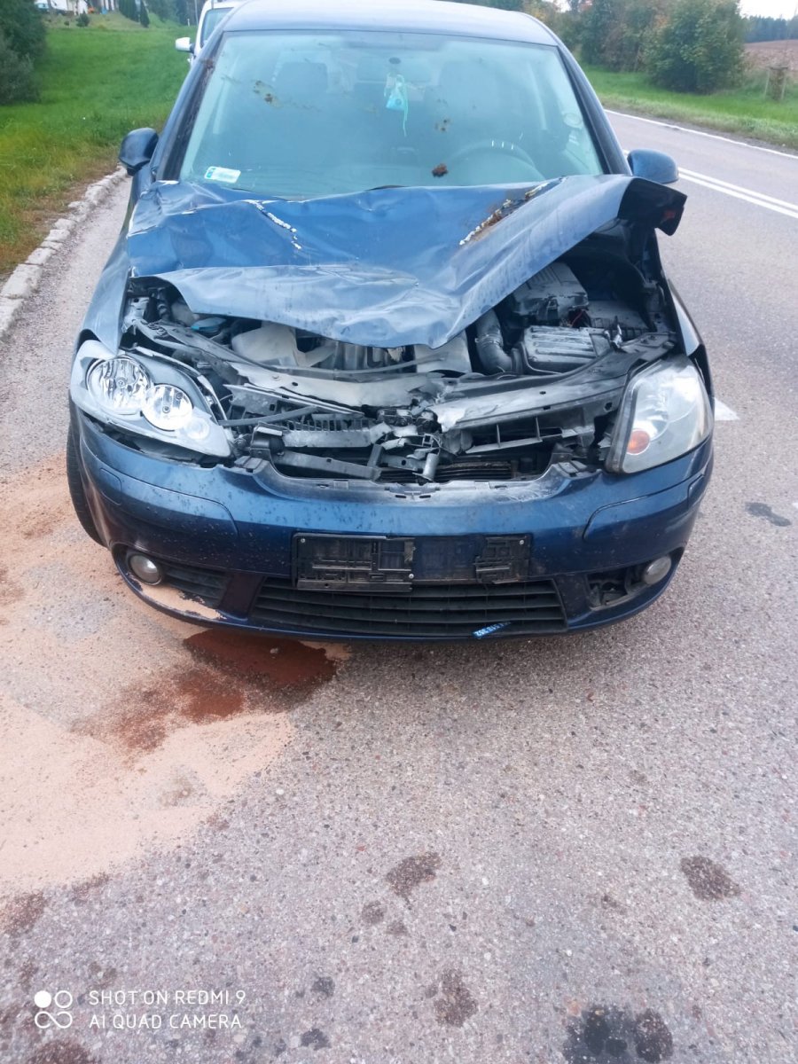 W czwartek (16.09.21 r.) w godzinach porannych oficer dyżurny oleckiej policji otrzymał informację o tym, że na drodze krajowej nr 65 w miejscowości Ślepie, kierowca samochodu osobowego marki VW, zderzył się z wybiegającym z łąki koniem. Zderzenie było na tyle poważne, że spod maski samochodu zaczęły wydobywać się kłęby dymu, a sam samochód zapalił się. Na szczęście nikomu się nic nie stało, a koniem zaopiekował się jego właściciel który został przez policjantów pouczony.