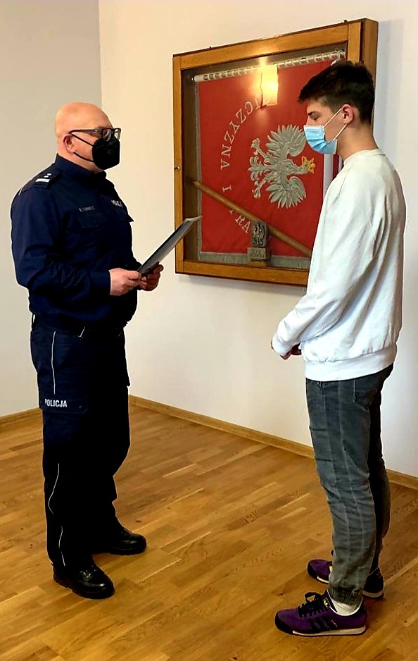 W środę (02.02.22 r.) Komendant Powiatowy Policji w Olecku, mł. insp. Jerzy Kuprewicz podziękował oraz złożył gratulacje 15-letniemu uczniowi liceum ogólnokształcącego w Olecku, za wzorową postawę obywatelską w związku z wypadkiem drogowym (12 stycznia 2022 r.) w Olecku na Placu Wolności. Mężczyzna gdy zauważył, że kierowca skody potrącił na przejściu dla pieszych kobietę, niezwłocznie zareagował i wezwał na miejsce pomoc .